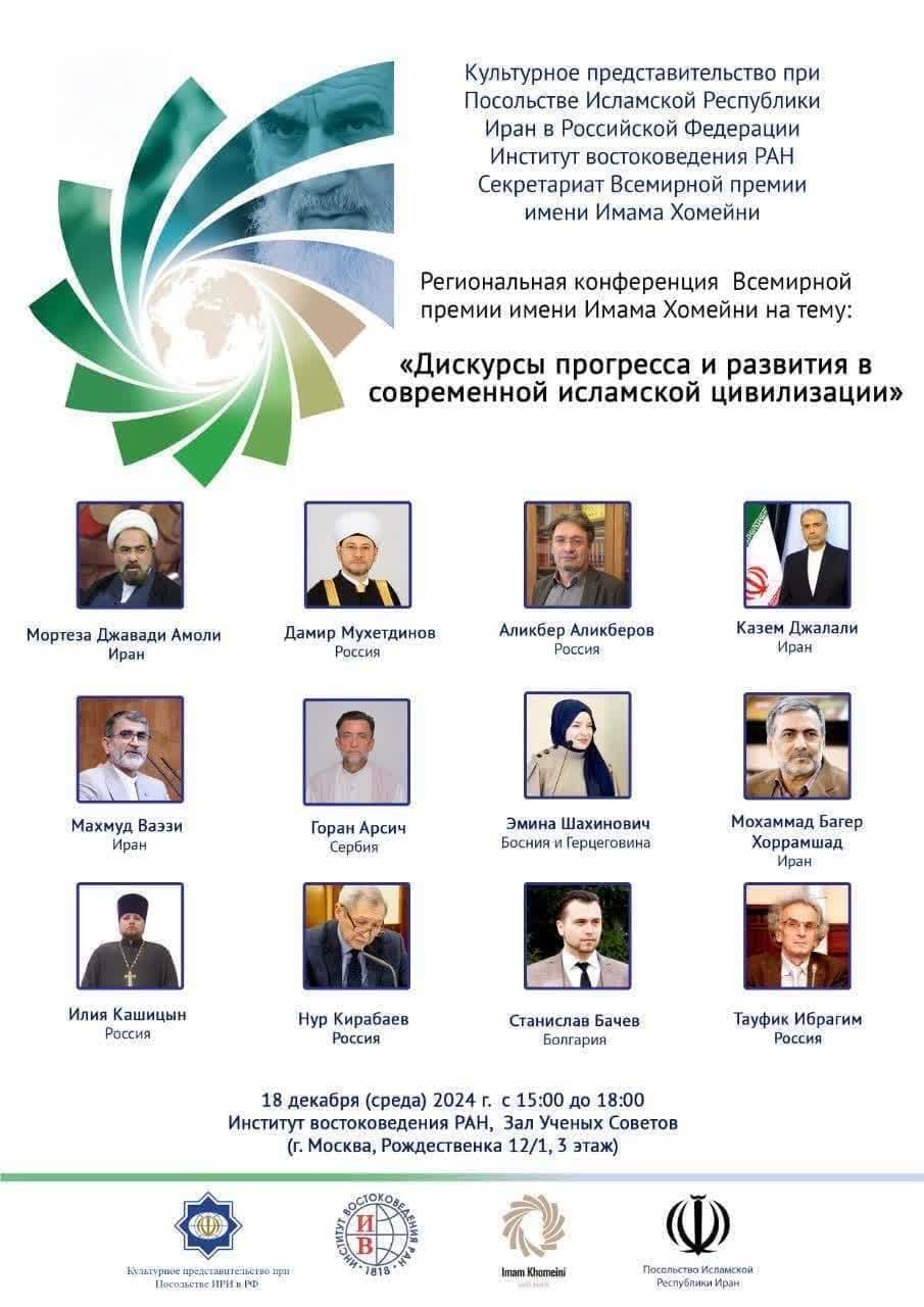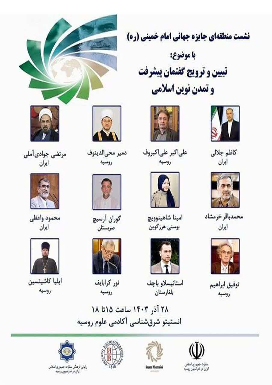 نشست منطقه ای جایزه جهانی امام خمینی(ره) با موضوع «تبیین و ترویج گفتمان پیشرفت و تمدن نوین اسلامی» ۲۸ آذرماه با سخنرانی پژوهشگرانی از ایران، روسیه، صربستان، بلغارستان و بوسنی هرزگوین در انستیتو شرقشناسی آکادمی علوم روسیه برگزار می شود.